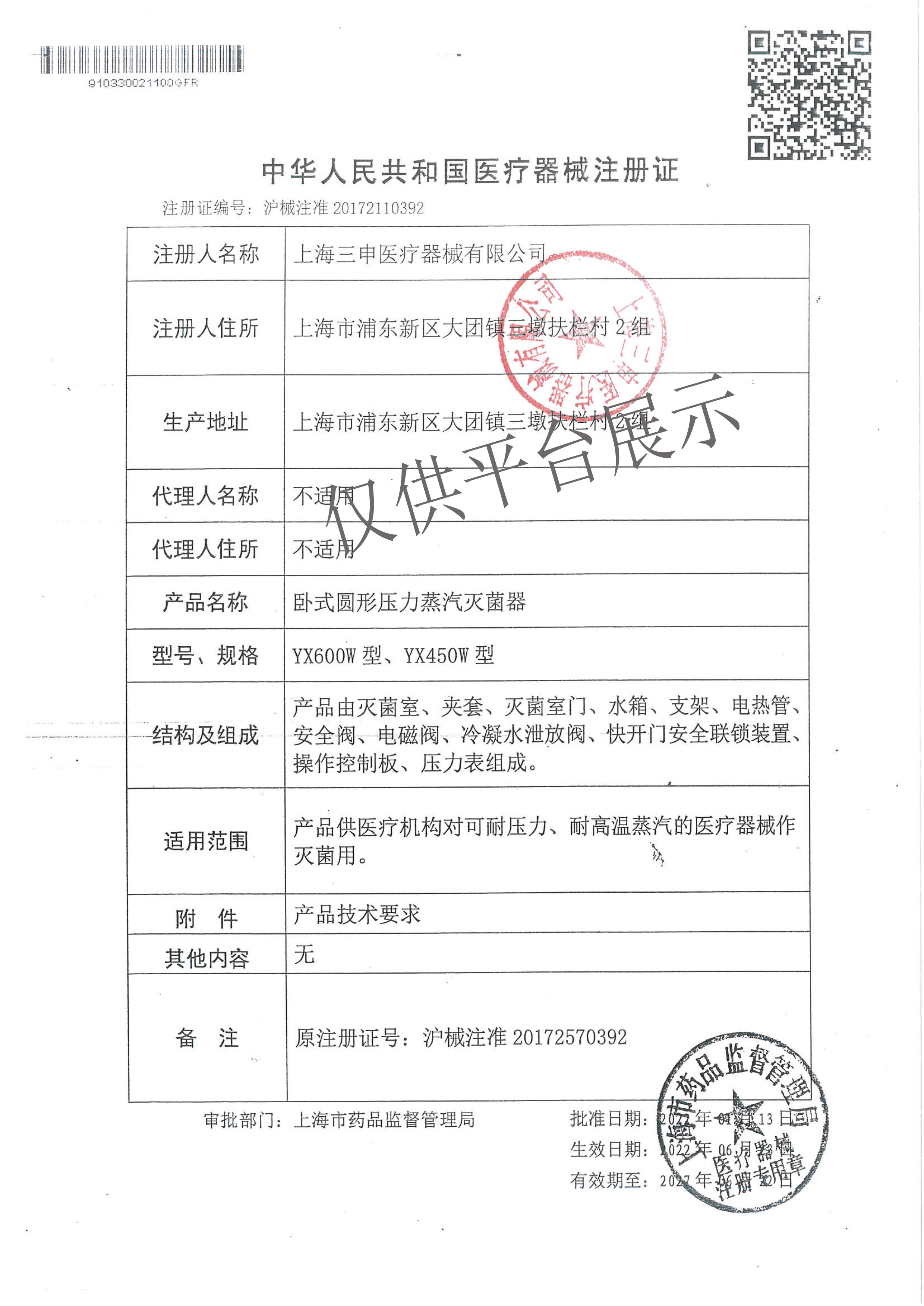 | 產品名稱 : | 三申臥式圓形壓力蒸汽滅菌器YX450W |